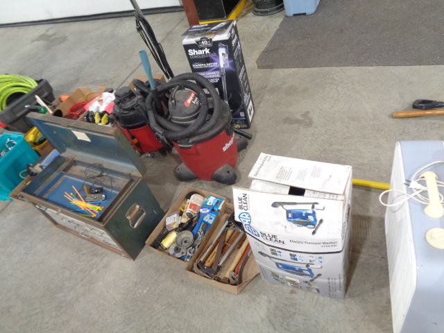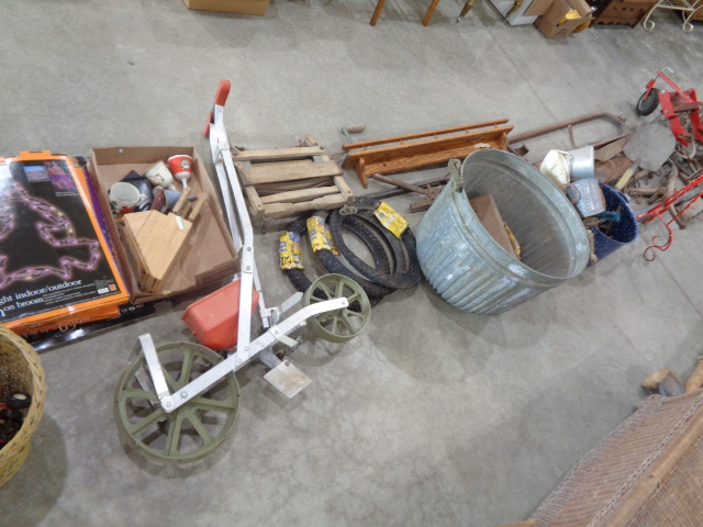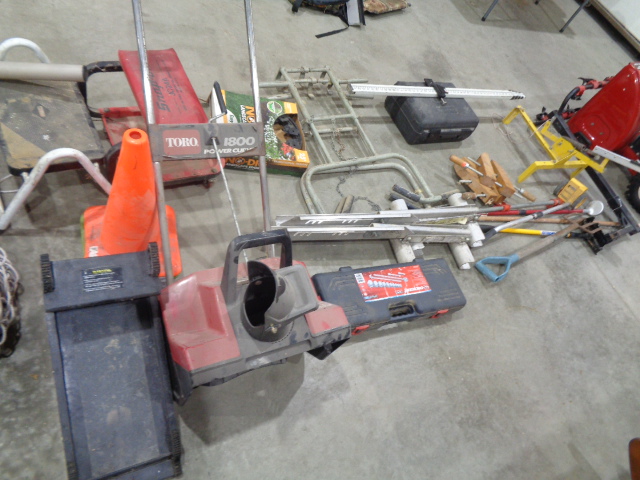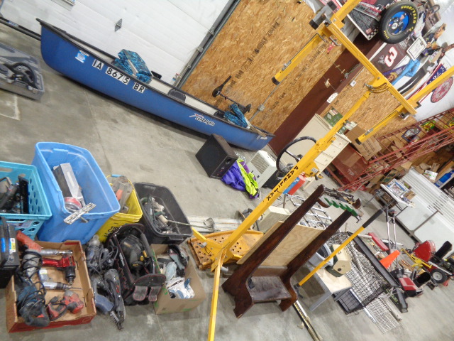 Sundolphin Scout Elite 3 seat Canoe, 12V troll motor * Craftsman 24” snowblower, ES * 16” scroll saw * hand tools and handle tools * yard tools * tool box * 2 small shop vacs * small air compressor * step ladders * pet taxi * Champion shooting rest * Huffy Bike * Stihl and 2 Poulan chain saws * few new socket sets * garden planter * small scaffold * small 220V power washer * air tools and elec. tools * Panel Jax sheetrock jack * cement bull float * wood clamps * bike carrier * jack stands * MK 770 wet tile saw * 2 wheel cart * Ridgid table saw * Troy Bilt push mower w/bagger * Hammock and stand *