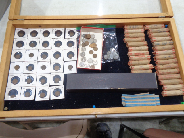 COINS: (SOLD LAST) few silver halves and quarters * 42 silver rounds * 4500 plus wheat pennies * 60+ Indian head pennies * few steel pennies * many bicentennial coins * 4 Whitman books of Jefferson nickles * 1 Whitman of Buffalo Nickles * 6 Whitmans of pennies * 1 Whitman of Indian heads and flying eagles *