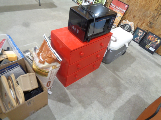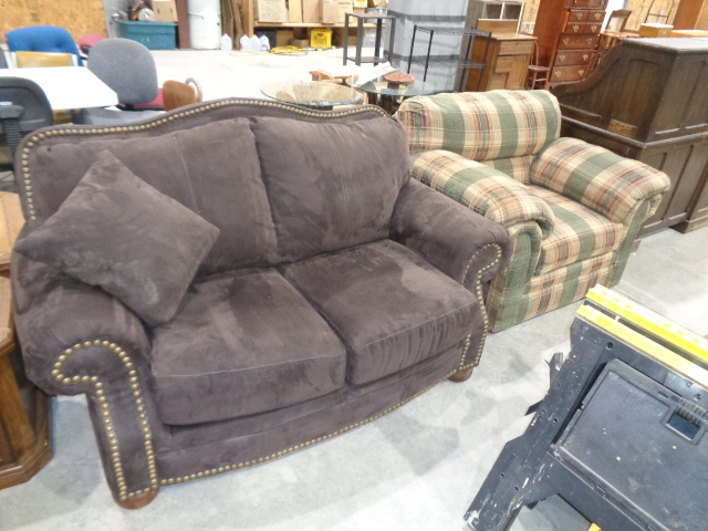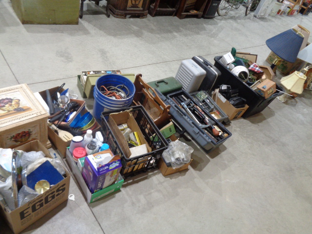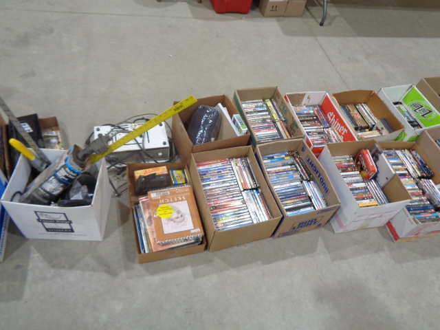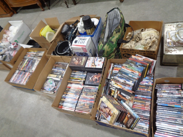 HOUSEHOLD: Leather reclining sofa * Sentry lock box * Many small kitchen appliances * lamps and pictures * kitchen items * luggage * Dyson and Kenmore vacuum * totes * glassware * silverware * pet taxi * 4 wheel walker * infrared heater and others * flatscreen TVs * 800+ DVD movies * 300+ music CDs * many toys, race tracks * electric roaster * microwave * 2 Patio table and chair sets, outdoor loungers * chairs and barstools * 8 chests and dressers * end tables * Microfiber loveseat * oversized chair * modern hutch * artificial Xmas tree * medium GE chest freezer * double bed * games * oak roll top desk * many boxes of Household items *