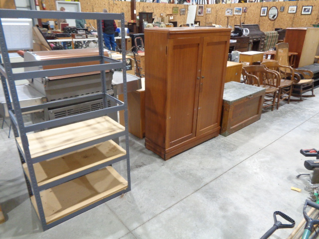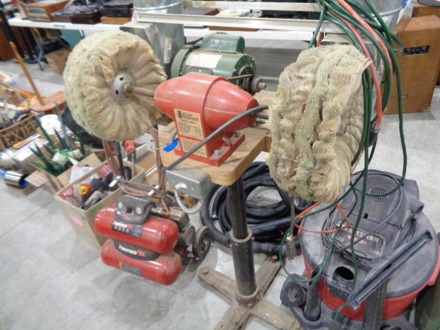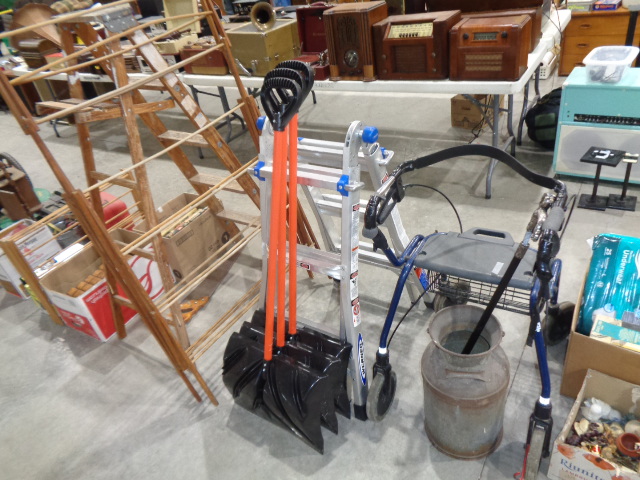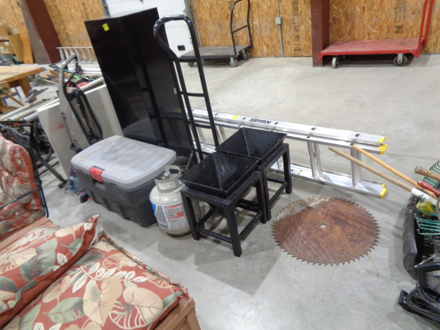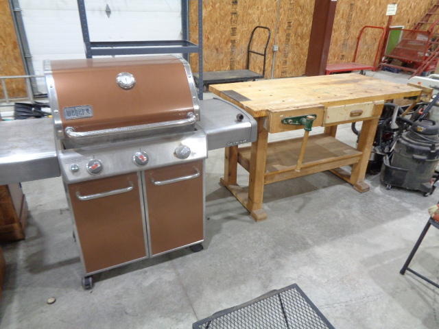 TOOLS, OUTDOORS: Small Unimat metal lathe, unique * Werner alum utility ladder * Stewart Macdonald buffer on stand * wood working table w/ 2 vises * step ladder * push mower * many hand tools and shop supplies * Schwinn and electric chopper bike * 2 small window AC * small air compressor * Craftsman Shop vac and others * 5 gal of redwood stain * yard tools * Keller 20’ ext. ladder, new * 2 wheel cart * roller stand * Rubbermaid garage cabinet * Weber 3 burner gas grill *