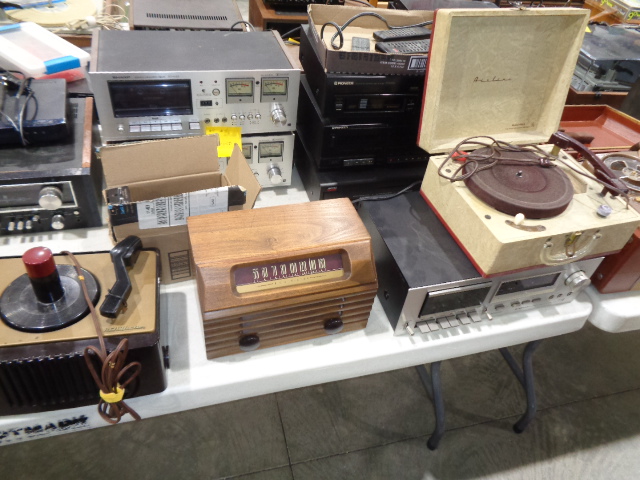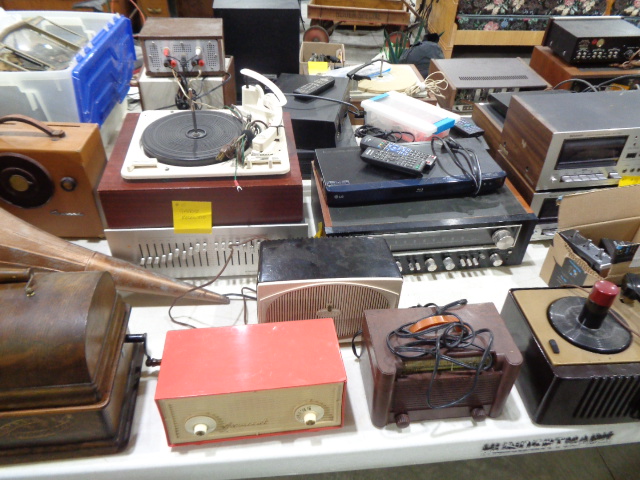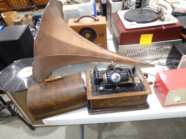VINTAGE MUSIC: Edison tabletop phonograph and horn * Brunswick Floor model phonograph player * Victor Floor model Victrola * Atwater Kent floor radio * 20+ Vintage Tabletop radios * RCA Radiola 18 * numerous small record players * 33, 45, 78 record albums * many VCRs/DVD players * many vintage radio tubes *